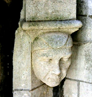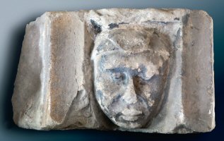 Deze kop, ingeklemd in een haakse hoek, is duidelijk van een man en heeft een hoofddeksel (muts?) op met een flap naar de voorzijde. Kopie in Franse kalksteen. Het originele blok is bewaard in de bouwloods en is gehakt uit Ledesteen.48 | 30 |
