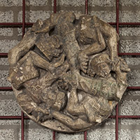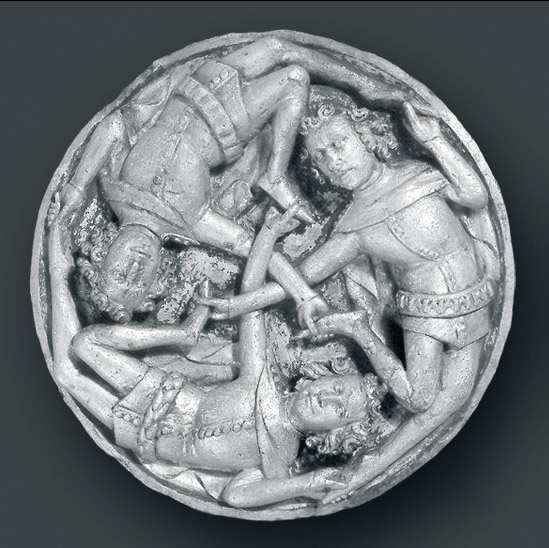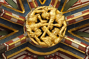 straalkapel 6 (van noordwest naar zuidwest)Drie in kringloop elkaar vastgrijpende en rondwentelde mannen. Deze voorstelling vertoont gelijkenis met die van een sluitsteen in de kerk van Halle, waar het drietal wentelende krijgslieden rond de wisseling van de 14de naar de 15de eeuw gedateerd wordt. | 263 |