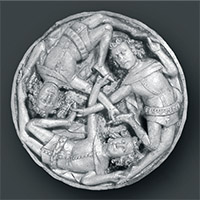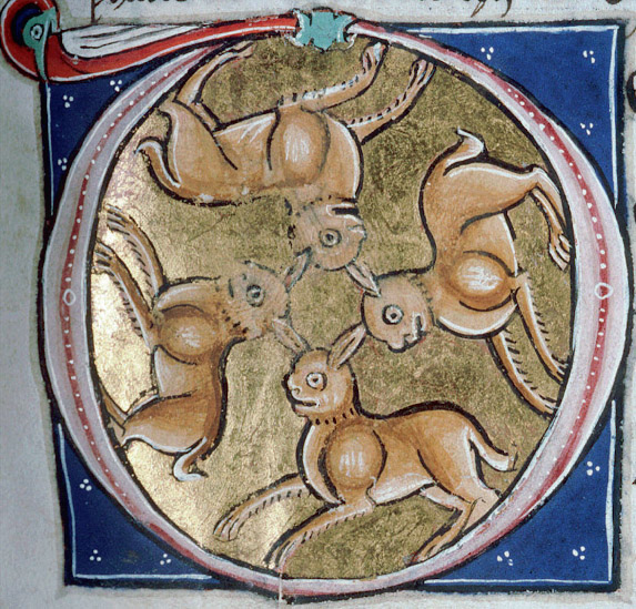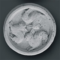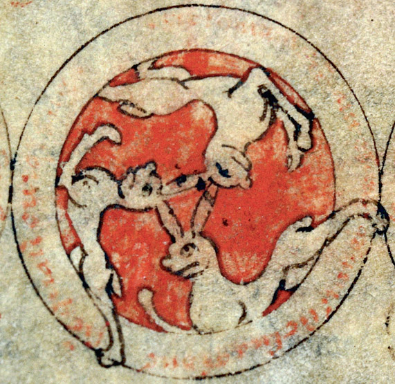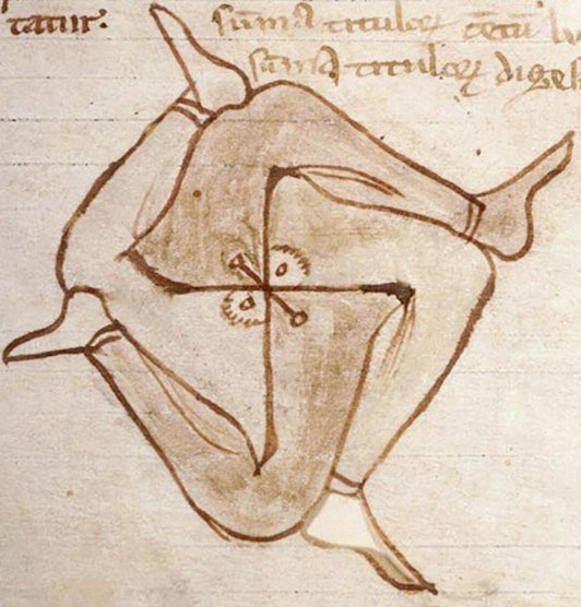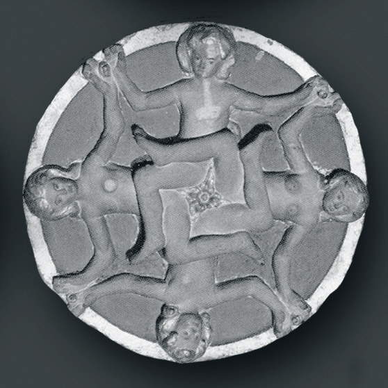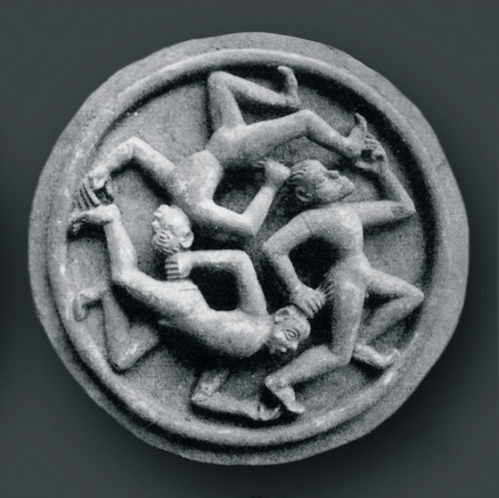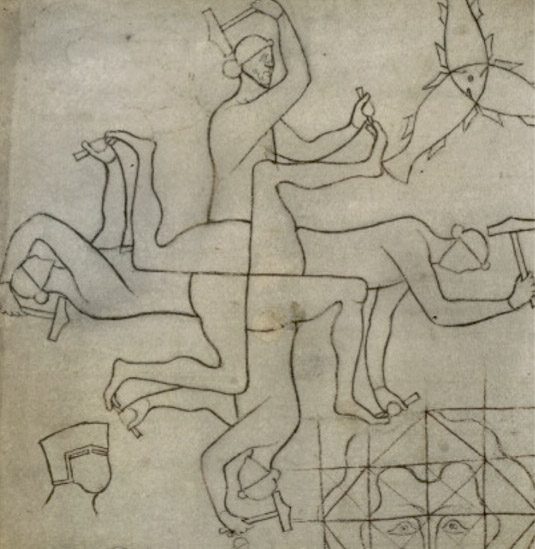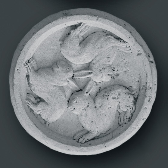 draaiende mannetjes (s5). De drie figuren zijn vrijwel identiek aan elkaar, zowel wat betreft de houding als de kleding, waardoor een driezijdig gelijke voorstelling ontstaat. De mannetjes zijn niet gekroond, zoals Van der Vaart beweert, maar dragen ieder een bonnet.190 Zijn gesuggereerde verwijzing naar het Rad van Fortuin, waarop koningen ronddraaien, houdt dan ook geen stand. De drie mannen zijn rijk gekleed; de bonnet is voorzien van een rozet, de jakken zijn afgezet met versierde banden en ze dragen ieder een klotendolk aan de mooi gedecoreerde gordel. Door de rijke kledij zag Knipping er drie ‘wereldse hofjonkers’ in, die ‘De Drie Begeerlijkheden’ gestalte geven in ‘de kringloop der wereld’.191 In de zuidbeuk van de Sint-Martinuskerk in Halle bevindt zich een veertiende-eeuwse sluitsteen die weliswaar in stijl verschilt, maar wat betreft het onderwerp treffend gelijkend is aan de Bossche sluitsteen (afb. 67a, 1). De Bossche mannetjes grijpen met hun linkerhand een voet van het mannetje boven hen vast, terwijl ze met de andere hand een been van het mannetje onder hen vasthouden. Deze zeer gecompliceerde houding is precies die, waarin de figuren in Halle zijn vormgegeven. Bovenden zijn zij net als in de Sint-Jan goed gekleed met rijke gordels en capes. De dolken en de bonnetten ontbreken alleen. In Halle wordt de voorstelling ‘de drie jongelingen’ genoemd, naar het in Daniel 3:6 beschreven verhaal van de drie mannen die door Nebukadnezar in de oven werden geworpen en dit overleefden. Een prachtige variant op dit ronddraaiende thema is de veertiende-eeuwse ‘Dreimännleinstein’ uit de voormalige Marienkirche in Nagold (D.), die wordt verklaard als een symbool van de Heilige Drie-eenheid.192 Op deze sluitsteen draaien drie mannetjes rond, die elkaar met de ene hand aan de haren trekken en met de andere onder een voet kriebelen (afb. 67a, 2). Wat deze voorstelling precies met de Drie-eenheid te maken heeft, wordt niet duidelijk. Toch wordt ook de in kerken en kapellen veel voorkomende middeleeuwse uitbeelding van de drie rondrennende hazen, die met elkaar drie oren delen, in relatie gebracht met de Drie-eenheid (afb. 67a, 3). Deze uitbeelding komt al in de vroege middeleeuwen voor in de Boeddhistische en Islamitische kunst en heeft vermoedelijk een heel andere oorsprong. Bovendien bestaat er ook een variant met vier hazen (afb. 67b, 4). Dat het gebruik van drie identieke elementen bij dit soort ronddraaiende beelden dus niet vanzelfsprekend is, bewijst ook een sluitsteen uit de late dertiende eeuw in de collegiale kerk Saint-Croix in Luik (afb. 67a, 4). Deze steen toont vier gelijke figuren, in dit geval ogenschijnlijk naakte vrouwen die dansend in een kring elkaars handen vasthouden. Merkwaardig zijn de opgetrokken benen, die zij niet alleen delen maar die ook samen een decoratief motief in de vorm van een soort swastika vormen.193 Dit doet sterk denken aan een tekening van Villard d’Honnecourt, waarop vier ronddraaiende mannen op gelijke wijze vier benen delen (afb. 67b, 2). De vier mannen stellen beeldhouwers voor, die de voet van de figuur voor hen in de | 140 |