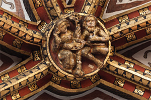 Sluitsteen s6 verbeeldt een vrouw en een wildeman. Links zit een vrouw met lange vlechten, duidelijk afwijkend van de Mariabeeltenissen op andere sluitstenen. Met haar rechter hand omklemt zij een vlecht en met de andere hand houdt ze een ketting vast die om een boom in het midden van de voorstelling is geslagen. Aan deze ketting is aan de rechter zijde een gehurkt zittende wildeman geketend. De ketting is om zijn middel geslagen en bovendien om de arm waarmee hij de boom vast houdt. De geheel behaarde wildeman heeft een baard en lange haren, en draagt een afgebroken knots op de schouder. Aan het negentiende-eeuwse gipsafgietsel is de knots nog intact. Hoewel er een enorm schaalverschil bestaat, is de weergave van de wildeman zeer vergelijkbaar met dergelijke uitbeeldingen aan de buitenzijde van de straalkapellen en aan het hoogkoor. De betekenis van de vrouw die een wildeman gevangen houdt is niet direct duidelijk. Peeters schreef in 1962 een beschouwing over de wildemannen en -vrouwen in en | 141 |