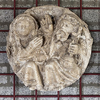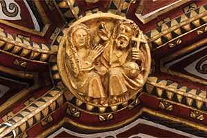 Op de sluitsteen in de hier noordelijk aan grenzende kapel wordt de zegening van Maria weergegeven (s9). Links zit Maria, het haar in lange tressen of vlechten, met de handen gevouwen voor zich. Rechts hiervan zit een bebaarde man, blootsvoets onder een lang gewaad. Met de rechter hand maakt hij een zegenend gebaar en met de andere hand houdt hij een rijksappel op de schoot. Volgens Peeters stelt de voorstelling “de gekroonde Heilige Maagd” voor, “gezegend door God de Vader (met tiara en globe met kruis)”.201 Het opvallende aan deze sluitsteen is dat beide figuren ongekroond zijn. Maria heeft niets in haar haar en de man heeft lange haren, draagt een bloemenkrans op het hoofd en alleen een rijksappel in de linker hand, als ware hij de ‘Salvator Mundi’. Van der Vaart spreekt dan ook niet van God maar van Jezus die zijn moeder de zegen geeft.202 Ook hier is er een treffende stilistische gelijkenis met de Mariabeeltenissen aan de buitenzijde van de straalkapellen waarneembaar. | 143 |