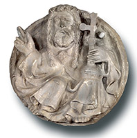 De westelijke sluitsteen in deze beuk toont een zittende Christus, blootsvoets en gehuld in een lange mantel met een vierkante speld die met een bloemmotief is versierd (s15). Christus heeft een korte baard en lang, niet erg uitgewerkt afhangend haar, en draagt een bloemendiadeem.41 Met zijn rechter hand maakt hij het zegenend teken en met de linker hand houdt hij een wereldbol met een kruis daarop vast, die op zijn knie steunt. Christus is hier uitgebeeld als Salvator, verlosser, redder van de wereld. | 93 |