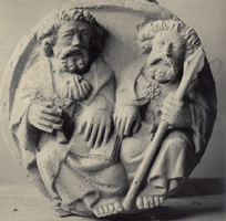De volgende steen toont twee apostelen (s25). Links zit Jacobus Major, herkenbaar aan de Jacobschelp die hij als mantelspeld draagt. Hij heeft een baard en wijd uitstaand krullend haar. Zijn linker hand rust op een opengeslagen boek op zijn schoot, terwijl hij in de andere hand een onbekend voorwerp vasthield, dat nu is afgebroken. Rechts zit apostel Phillipus. Hij heeft krullend haar en een baard en draagt een overmantel met een bloemvormige mantelspeld. In zijn linker hand heeft hij de lans waaraan hij herkenbaar is en de rechter hand rust op zijn schoot. | 162 |