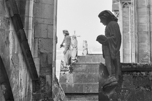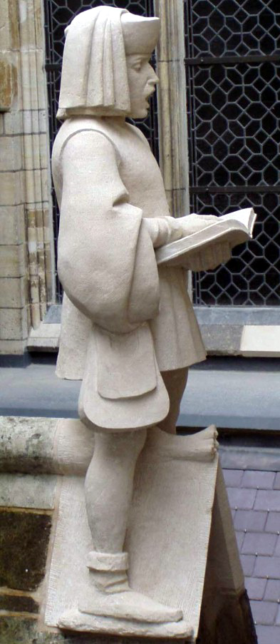 Op deze plaats, die vanaf de begane grond niet zichtbaar is, stond van 1946 tot 2001 een door Jos Goossens gehakt tufstenen beeld van een zanger. In de door Mosmans opgezette iconografie was namelijk geen plaats meer voor het beeld van Hendrik van der Geld, dat hier omstreeks 1905 was geplaatst. Dit kalkstenen beeld van een man, blazend op een hoorn, was door Van der Geld gehakt naar een ontwerp van Lambert Hezenmans dat in het Museum van Uden wordt bewaard.84 In het depot van de bouwloods bevindt zich nog een terracotta ontwerpmodel voor het beeld, vermoedelijk eveneens van de hand van Van der Geld. Het beeld zelf is nu opgesteld in Museum de Bouwloods.85 Het tufstenen beeld van een zanger uit 1946, waarvan in het depot van de Bouwloods ook een gipsen model wordt bewaard, was in amper zestig jaar zo verweerd dat het niet kon worden gehandhaafd. In 2002 is door Ton Mooy een nieuw beeld gehakt, eveneeens een zanger voorstellend, en in het voorjaar van 2003 op de kerk geplaatst. | 77 |
