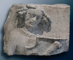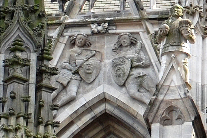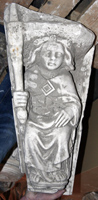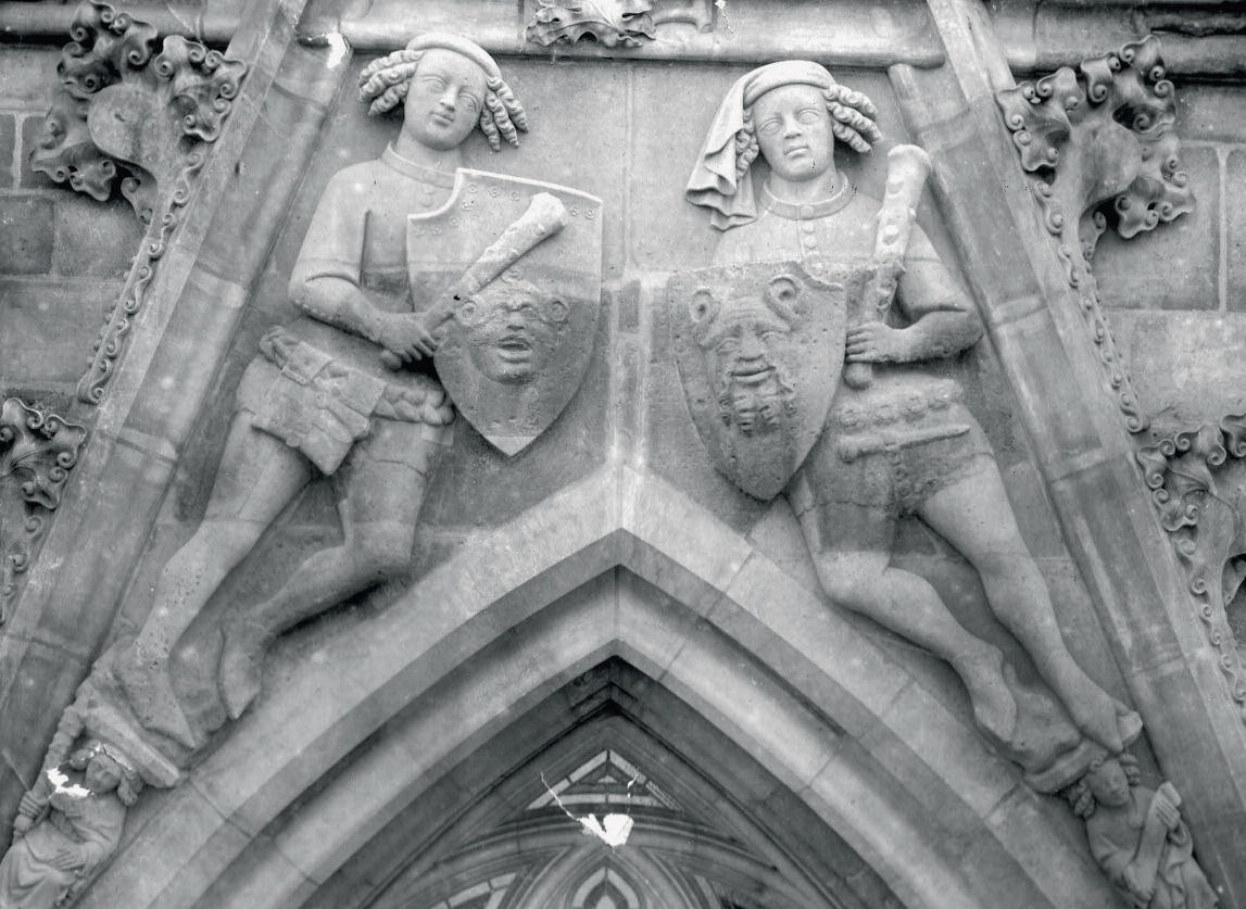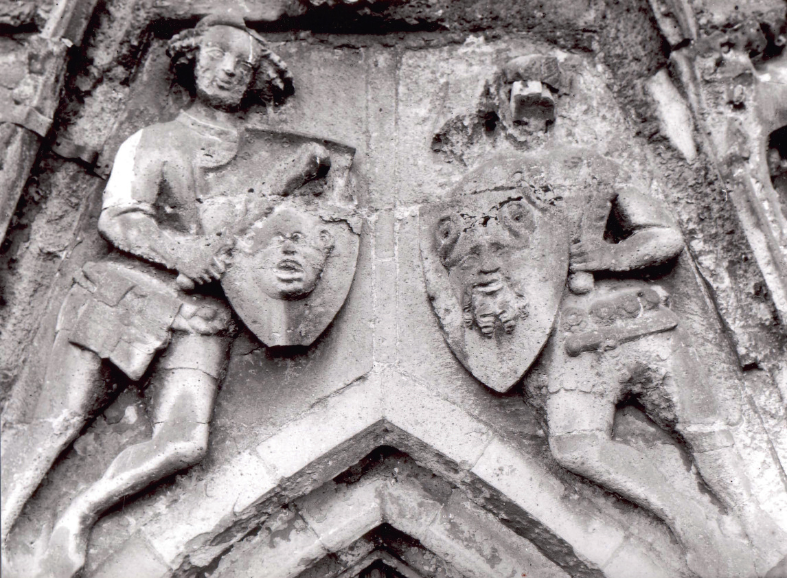 Voorafgaand aan het herstel van dit reliëf in 1914, waren twee mannelijke figuren herkenbaar, vrij goed geconserveerd gebleven, op het hoofd van de rechterfiguur na (z27). De linker figuur staat ten voeten uit, met karakteristiek één been iets opgetrokken, op een console waarop een zittende figuur met knuppel zichtbaar is.100 Goed bewaard zijn de puntige schoenen en de strakke hozen, waaromheen een gevlochten gordel is aangebracht. Aan de gordel draagt de man een heuptas met een grote gesp, waarin een klotendolk is bevestigd. De man draagt een nauwe lijfrok met een strakke kraag, afgedicht met grote knopen. Opmerkelijk zijn de kleine sierknoopjes, die in een rij zijn aangebracht aan de onderzijde van de mouw. In de linkerhand houdt de man een schild op, dat voorzien is van een masker met een bol, en bijna lachend gezicht met vreemde oren: een goedaardig monster. De bovenrand van het schild is afgezet met kleine rozetten. In de rechter hand houdt de figuur een houten, knoestige knuppel omhoog. De rechter schouder van de figuur is bijgewerkt met stuc- | 184 |