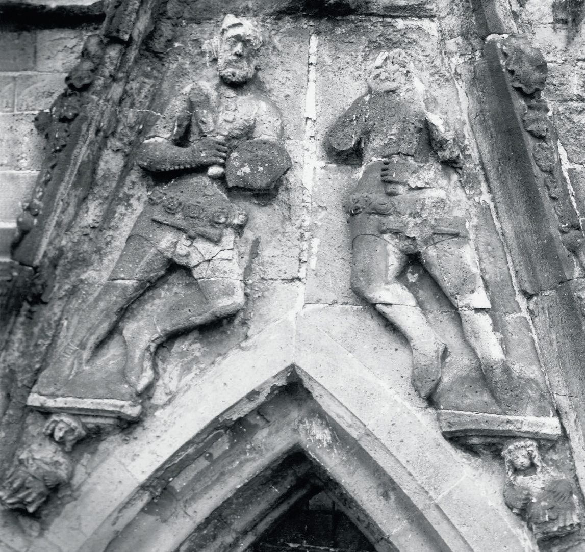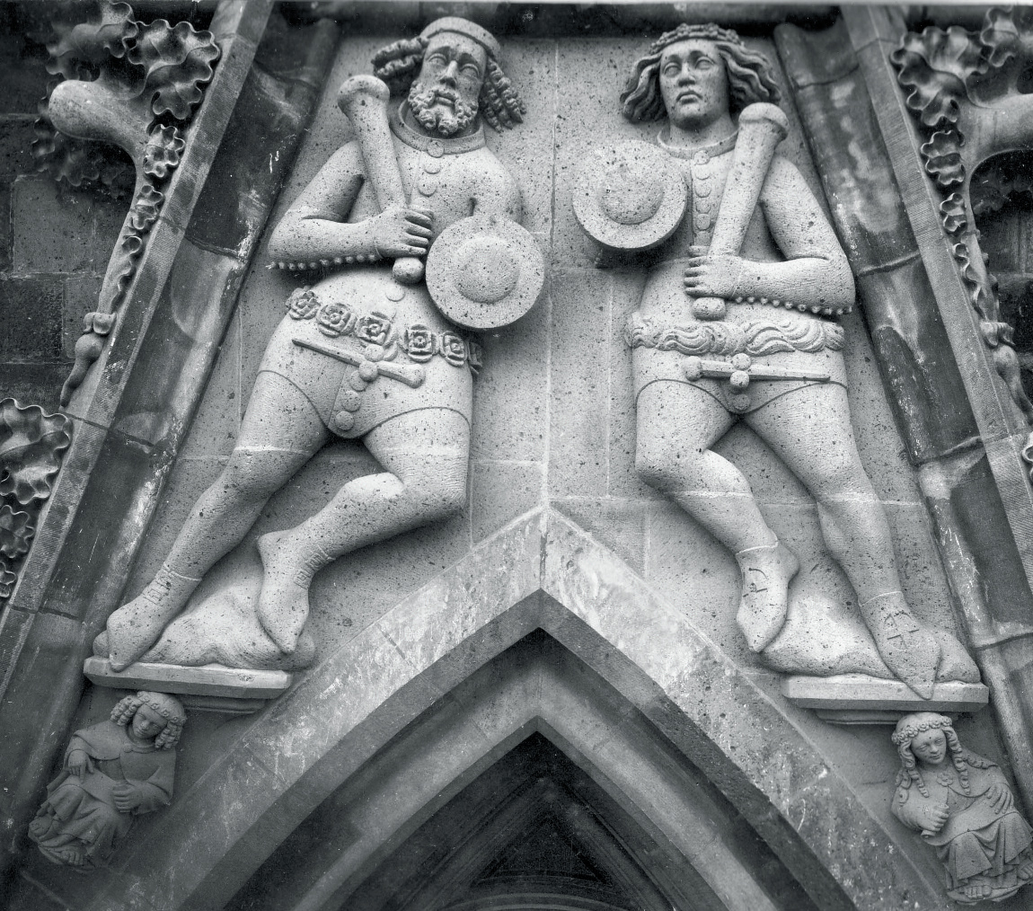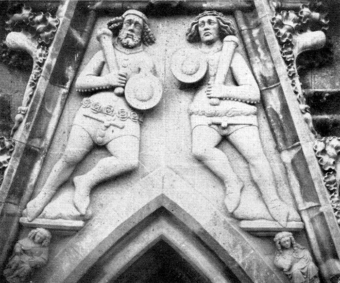 Thema en compositie vrijwel gelijk aan wimberg 7(F), maar in plaats van zwaarden dragen de mannen knotsen. Als kraagstenen meisjes met lange pijpekrullen, gekroond met bloemenkransen, banderollen in de hand. In 1917 door een aangevulde copie vervangen. (afb. 232-233)