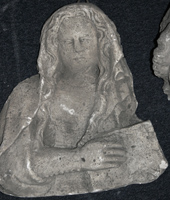 Het goed bewaard gebleven authentieke reliëf, nu in Museum de Bouwloods, toonde voor de restauratie twee figuren ten voeten uit. De consoles waarop zij staan waren beide onherkenbaar verweerd. De linker, mannelijke figuur stond blootsvoets, met één voet op de console. De man, een engel, was gekleed in een lang gewaad met grote open kraag die bijeen gehouden werd door een vierkante, versierde mantelspeld. Het goed bewaarde hoofd had lang in tressen krullend haar. Links was een vleugel vrijwel intact; rechts was slechts de afdruk van een verdwenen vleugel zichtbaar. De linker arm van de engel was niet meer aanwezig. De rechter arm stak hij omhoog; de hand was afgebroken. Rechts bevond zich een vrouwelijke figuur in een lang gewaad en met hoofdsluier. De figuur had lange haren, weergegeven met gestileerde ‘krullen’. De vrouw, Maria, had een opengeslagen boek in haar hand. Links naast Maria was een vaas met bloemen weergegeven. De vroegste afbeelding van het plastiek is een tekening van Lambert Hezenmans uit omstreeks 1870, bewaard in het tekeningenarchief van de bouwloods. In deze wat merkwaardige, sterk van de werkelijkheid afwijkende voorstelling, waarvan het overigens niet duidelijk is of het een schets voor een nieuw ontwerp betreft of dat getracht is het plastiek getrouw weer te geven, is naast de bloemenvaas ook een vogel (duif?) afgebeeld. De duif werd als symbool van de aanwezige Heilige Geest vaker bij Annunciatievoorstellingen | 109 |