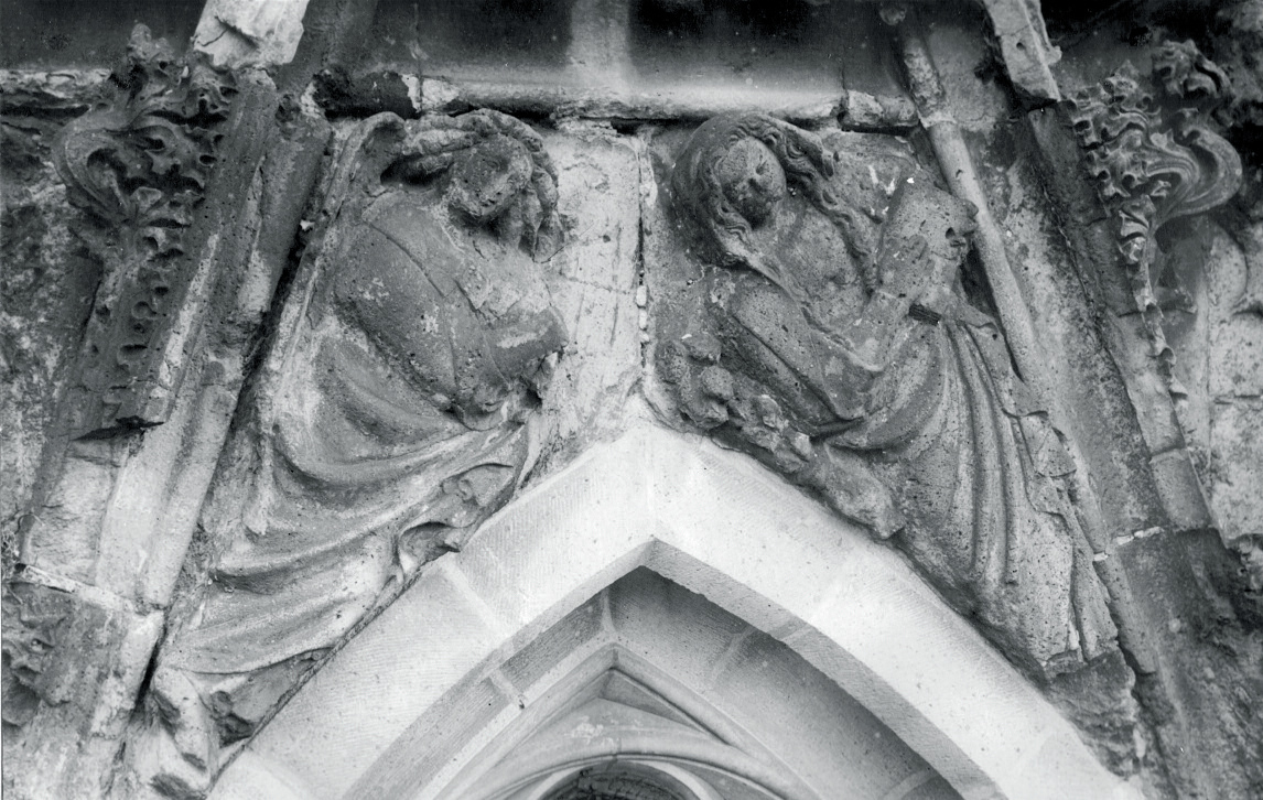 vleugel en de handen van de engel worden aangevuld. In het nieuwe reliëf kreeg de engel een scepter in de hand met een bekroning in de vorm van een fleur de lis, door Mosmans kritiekloos overgenomen in zijn beschrijving. Op de originele plastiek is hier niets van te zien, net zomin als op de negentiende-eeuwse tekeningen. Hoewel de engel vaak met een dergelijke scepter met fleur de lis wordt afgebeeld, is het zeer de vraag of deze interpretatie uit 1928 de juiste is. De betekenis ervan is immers exact dezelfde als die van de wel goed bewaarde vaas met lelies, namelijk de aanduiding van de reinheid van Maria. Het is niet waarschijnlijk dat deze symboliek dubbel, in een enkele voorstelling was weergegeven. | 107 |