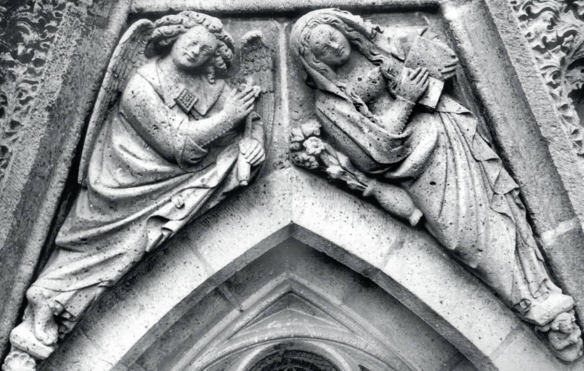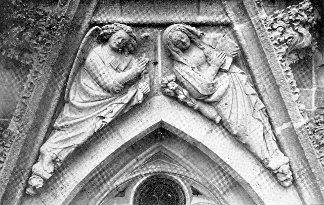 ‘De boodschap des engels aan Maria. Dit prachtig stuk sculptuur was vrij goed bewaard. Maria wordt tijdens de lezing in een gebedenboek door den engel der Annunciatie verrast. De traditionele lelietak-in-vaas is geestig naast de biddende Maagd over de boogronding gemodelleerd. Het knielen van den hemelbode Gabriël, met een lelie-geknopten staf in de hand, voor de diep-vereerde Gezegendste onder de vrouwen, is uitgedrukt door ’s Engels sterk vooruit-gebrachte linkerknie en -voet’.95