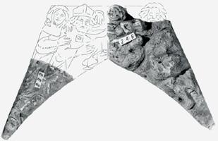 Het oorspronkelijke plastiek was redelijk compleet bewaard gebleven, maar door vele kalklagen plaatselijk dicht geschilderd. Alleen de hoofden van de twee uiterste figuren ontbraken deels. In het midden van het frontaal, doorlopend over de twee blokken tufsteen, was duidelijk het naakte Christuskind herkenbaar, liggend op draperieën of op een kussen. Geheel links, het hoofd ontbrekend, een vrouw die haar handen op de schouder van de figuur naast haar legt. De hoofddoek van de vrouw was in de vorm van een afdruk nog wel herkenbaar. De man naast haar was gekleed in een lange tuniek en stond op een onherkenbaar verweerde console. De man had lang, wijd staand krullend haar en droeg een met geometrische motieven versierde mijter. Hoewel de kin was afgebroken, was de afdruk van zijn baard nog aanwezig. Zijn rechter hand lag op het kussen van het Christuskind, de linker over de schouder van de vrouw rechts naast hem. Deze vrouw, waarvan alleen het gesluierde hoofd was te zien, droeg het Christuskind en plaatste het schijnbaar op het kussen; de vingertoppen van de vrouw waren nog juist herkenbaar onder het kind. Tenslotte was aan de rechterzijde een man zichtbaar, gekleed in een lang gewaad, gesloten met een mantelspeld. De man stond op een onherkenbare console. Zijn rechter hand rustte op het kussen, terwijl hij in zijn linker hand een ritueel mes heeft. Een groot deel van het hoofd ontbrak, maar de baard en een deel van de wild krullende haarlokken was nog wel aanwezig. Een negentiende-eeuws afgietsel van het hoofd van de man bleef echter wel bewaard in het depot van de bouwloods.104 | 120 |