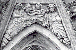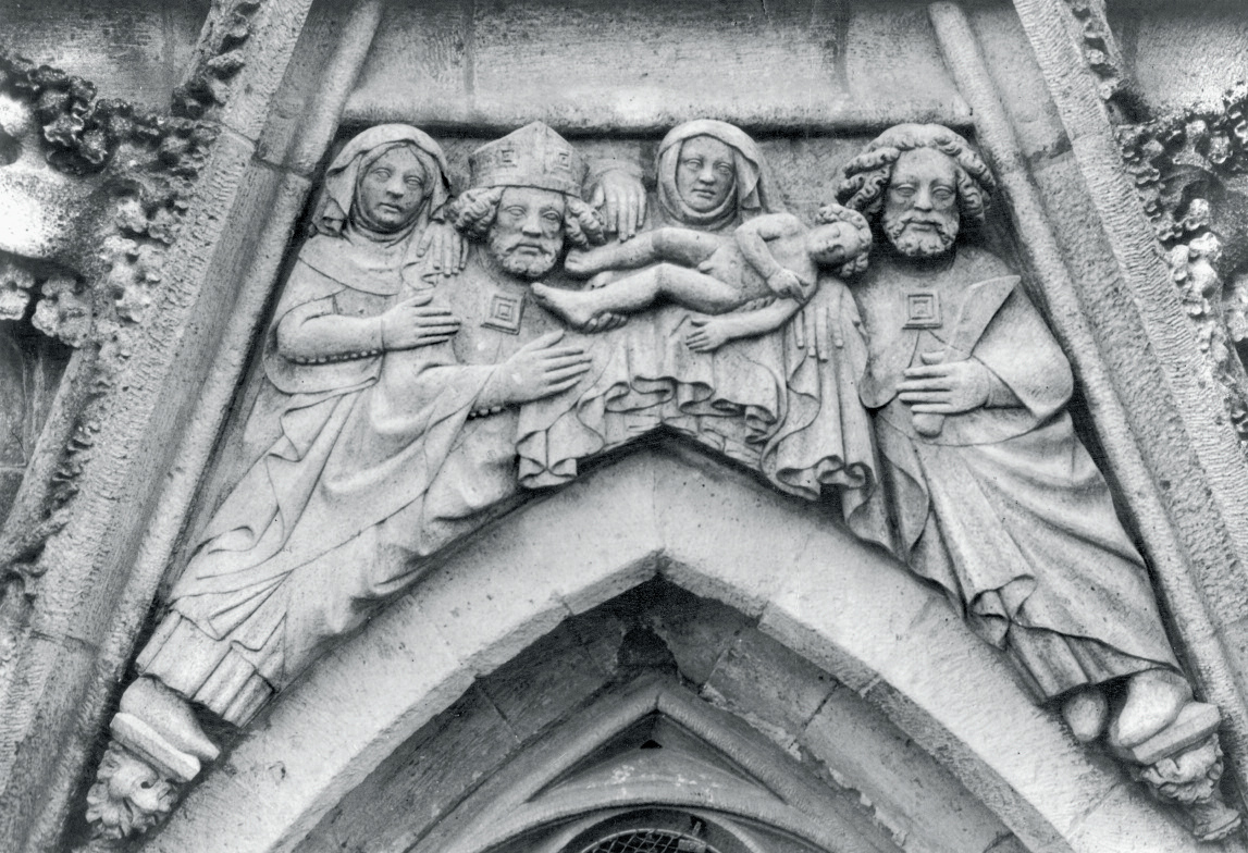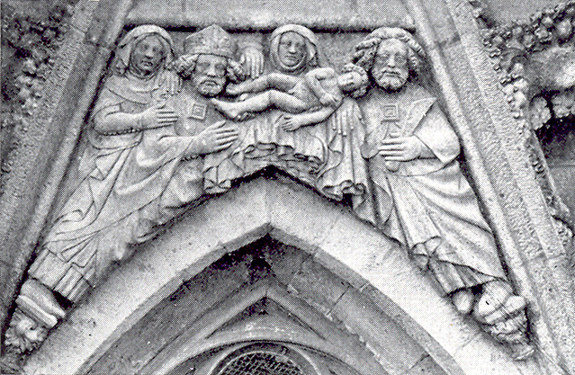 door Maria, en zoals Peeters al suggereerde zal met de figuur die op het reliëf achter het kind staat niet een vroedvrouw maar Maria zijn weergegeven.101 De man met de mijter stelt ongetwijfeld de priester van de tempel voor die het ritueel gaat uitvoeren. De figuur rechts is waarschijnlijk Jozef, die het rituele mes aanreikt. Wie de vrouw is achter de priester blijft duister, wellicht is een vroedvrouw bedoeld. Peeters beklaagt zich over het feit dat het voorwerp in de hand van de rechter figuur bij de restauratie ‘als een groot slachtmes is uitgelegd’, maar het mes was op het authentieke plastiek geheel bewaard gebleven en naar de oorspronkelijke proporties gekopieerd.102 | 111 |