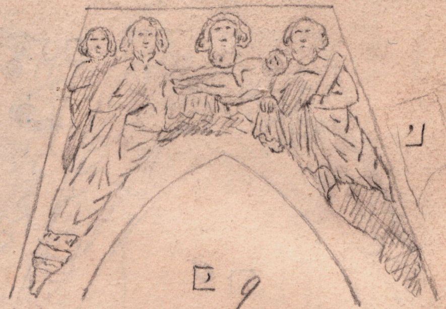 Het oorspronkelijke plastiek Z6 was redelijk compleet bewaard gebleven, maar door vele kalklagen plaatselijk dicht geschilderd. Alleen de hoofden van de twee uiterste figuren ontbraken deels. In het midden van het frontaal, doorlopend over de twee blokken tufsteen, was duidelijk het naakte Christuskind herkenbaar, liggend op draperieën of op een kussen. Geheel links, het hoofd ontbrekend, staat een vrouw die haar handen op de schouder van de figuur naast haar legt. De hoofddoek van de vrouw was in de vorm van een afdruk nog wel herkenbaar. De man naast haar was gekleed in een lange tuniek en stond op een onherkenbaar verweerde console. De man had lang, wijd staand krullend haar en droeg een met geometrische motieven versierde mijter. Hoewel de kin was afgebroken, was de afdruk van zijn baard nog aanwezig. Zijn rechter hand lag op het kussen van het Christuskind, de linker over de schouder van de vrouw rechts naast hem. Deze vrouw, waarvan alleen het gesluierde hoofd was te zien, droeg het Christus kind en plaatste het schijnbaar op het kussen; de vingertoppen van de vrouw waren nog juist herkenbaar onder het kind. Tenslotte was aan de rechterzijde nog een man zichtbaar, gekleed in een lang gewaad, gesloten met een mantelspeld. De man stond op een onherkenbare console. Zijn rechter hand rustte op het kussen, terwijl hij in zijn linker hand een ritueel mes heeft. Een groot deel van het hoofd ontbrak, maar de baard en een deel van de wild krullende haarlokken was nog wel aanwezig. Een negentiende-eeuws afgietsel van het complete hoofd van de man bleef echter bewaard in het depot van de bouwloods.96 Op de schets die de gebroeders Donkers in 1854 maakten, is het hoofd ook nog intact, evenals het hoofd van de vrouw uiterst links. Smits, die de plastiek niet van dichtbij kon bekijken, beschreef in 1907 de voorstelling als de Heilige Familie bij het pasgeboren Kind.97 Blijkbaar zag hij de mijter aan voor een “eigenaardig diadeem” en interpreteerde hij de hand naast het gezicht als het lange haar van Maria.98 Wanneer hij het mes in de hand van de rechter figuur had herkend, was hij zeker op het thema van de besnijdenis gekomen, maar hij hield het voorwerp voor een afgebroken staf, wat paste in de opvatting dat de | 109 |