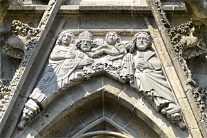 Hoewel niet veel voorkomend is het thema van de besnijdenis wel belangrijk in de Christelijke kunst, daar de gebeurtenis in direct verband wordt gebracht met de naamgeving van Jezus en omdat het bloed van de Verlosser voor de eerste maal wordt vergoten. Het tafereel speelt zich gewoonlijk af in de tempel, in aanwezigheid van de ouders. Meestal wordt het kind gedragen door Maria, en zoals Kees Peeters in 1985 al suggereerde zal met de figuur die op het reliëf achter het kind staat niet een vroedvrouw maar Maria zijn weergegeven.109 De man met de mijter stelt ongetwijfeld de priester van de tempel voor die het ritueel gaat uitvoeren. De figuur rechts is vermoedelijk Jozef, die het rituele mes aanreikt. Wie de vrouw is achter de priester blijft duister. Peeters beklaagt zich over het feit dat het voorwerp in de hand van de rechter figuur bij de restauratie ‘als een groot slachtmes is uitgelegd’, maar het mes was op het authentieke plastiek geheel bewaard gebleven en naar de oorspronkelijke proporties gekopieerd.110Het relief uit 1984, een ‘kopie’ door de gebroeders Kemperman in zandsteen, heeft het karakter van het plastiek drastisch veranderd. De veranderingen zijn legio, maar vooral de gelaatsuitdrukkingen en de haardracht van de drie figuren aan de rechter zijde vallen op. Ook het Christuskind kreeg een geheel ander hoofd. Het hoofd van de figuur uiterst rechts slaat alles wat betreft veranderingen en doet je afvragen of de beeldhouwer echt een afgietsel van het plastiek uit 1931 als voorbeeld heeft gebruikt. | 123 |
