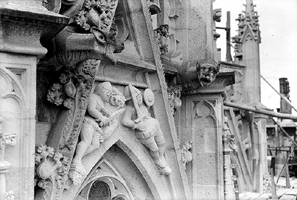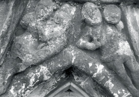 Het leeuwtje werd als console op aanwijzing van Mosmans aangebracht bij de restauratie. In werkelijkheid was er geen enkele aanwijzing voor. Bij de restauratie werd het reliëf uitgenomen en in Ettringer Tufsteen gekopieerd en aangevuld door Jos Goossens. Behalve het genoemde leeuwtje werden aan de hand van de restanten de twee zwaarden gereconstrueerd. Het gekopieerde reliëf werd in 1932 weer op de kerk geplaatst. | 153 |
