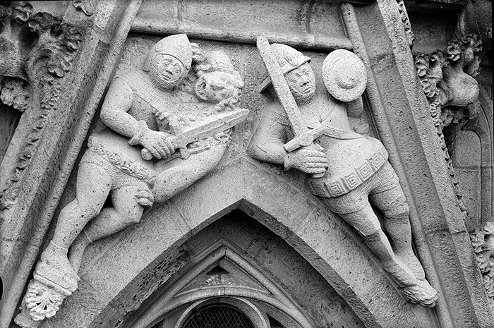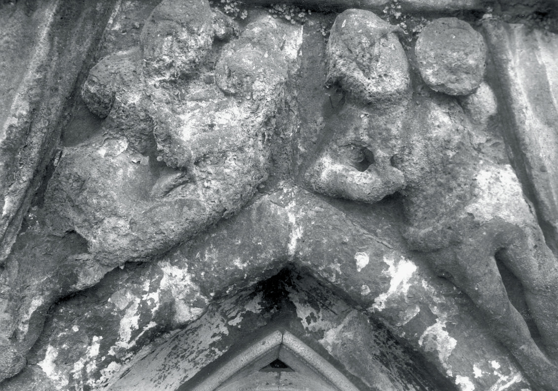 Al waren de hoofdvormen van de gestalten op het reliëf bij aanvang van de restauratie nog goed zichtbaar, het oppervlak van de tufsteen was door weer en wind danig vergaan. Aan de linker zijde was een mannelijke figuur, een soldaat uitgebeeld, staande op een console die vrijwel geheel verdwenen was. Het onderlichaam van de figuur was nauwelijks nog herkenbaar, maar aan details was te zien dat de man een nauwe broek droeg en een versierde gordel om de middel. Het gezicht van de man was nauwelijks nog herkenbaar, maar wel goed zichtbaar was de puntige helm met wangstukken en een maliënkolder rond de hals. Hoewel de rechter onderarm was verdwenen, was de hand die het deels bewaarde afwerende zwaard omklemde, nog wel herkenbaar. De soldaat werd aan zijn linker flank besprongen door een leeuw, waarvan na verwijdering van vele kalklagen nog veel details zichtbaar werden. De kop van de leeuw was op de onderkaak na verdwenen en alleen als afdruk in de steen zichtbaar. Een klauw tegen de helm en een klauw op de borst van de soldaat waren nog bewaard, evenals een achterpoot die zich afzette op de knie van de figuur en enkele wilde manen. Aan de rechterzijde van het reliëf was eveneens een op een verweerde console staande man, een soldaat uitgehakt. De man droeg een nauwe broek met geharnaste schoenen en kniestukken. Om de heupen droeg hij een met geometrische motieven versierde gordel op een plaatselijk heel goed bewaard maliënkolder. Om het beschadigde gezicht was een ‘ijzeren’ muts met kraag zichtbaar, waarop een helm geplaatst was. In de linker hand hield de man een klein rond schild, een rondas omhoog. De rechter hand omklemde een zwaardheft, een | 151 |