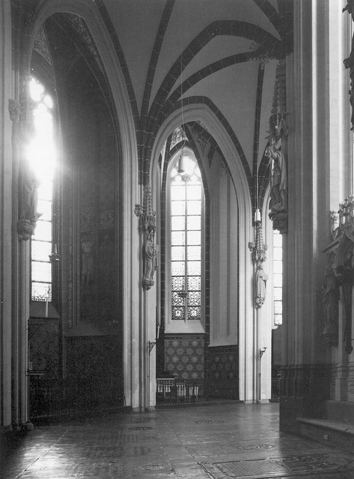 gebrandschilderde glazen van de straalkapellen uitgenomen en gerepareerd. Van de vensters werden de ijzeren brugstaven vervangen door bronzen en gescheurde montants vernieuwd. In augustus 1980 werden, om alvast het onderzoek naar de muur- en gewelfschilderingen aan te vangen, de drie zuidelijke kapellen inwendig in de steigers gezet, in maart 1981 de overige, later deelde ook de meest noordwestelijke straalkapel in dit werk, nadat daaruit in september-october het kleine orgel verwijderd was. Reeds bij de eerste reiniging kwamen decoraties uit minstens drie verschillende achtereenvolgende perioden tevoorschijn buiten de reeds zichtbare recente ensembles, onder andere van Dorus Hermsen, uit het begin van deze eeuw. In alle kapellen is tenslotte de neogotische decoratie (1894-1918) grotendeels hersteld, deels gereconstrueerd (1983-1984). | 123 |