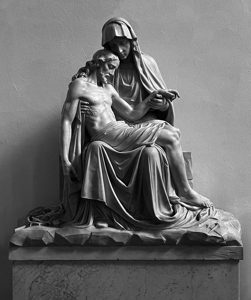 15. Marmeren beelden van de H. Petrus en H. Paulus met zuil en kapital 180 cm hoog. Piëta in wit marmer 125 hoog. St. Jan en Maria Magdalena eveneens in wit marmer 120 cm hoog met bijbehorende zuilen.