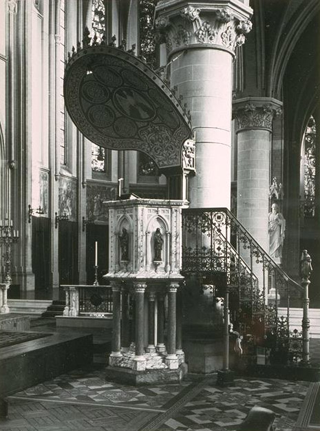14. Marmeren preekstoel op kolom en zes zuilen met gietbronzen trap en beelden van de vier evangelisten en St. Jan de Doper incl. klankbord.