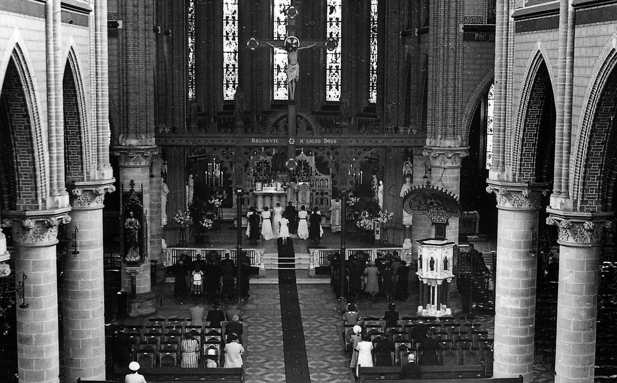 Versierd interieur van de Sint Leonarduskerk bij gelegenheid van het 25 jarig priesterfeest van pastoor Van der Kant.