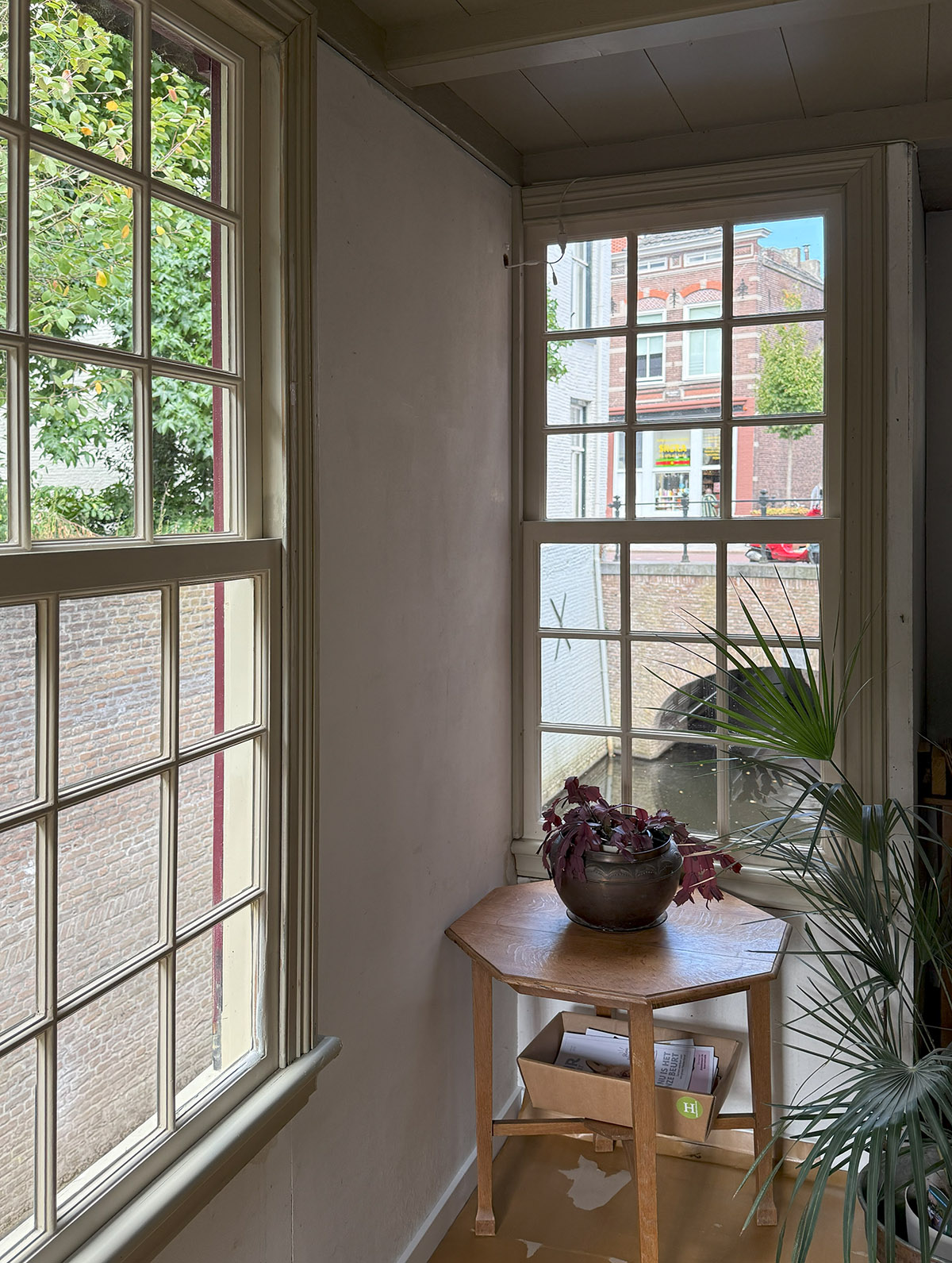Een gang met marmeren lambrisering leidt via een overkapte binnenplaats met groot tegeltableau naar de langs de Binnendieze gelegen tuin. Rond 1500 waren hier de alexianen of cellebroeders gevestigd. In feite is sprake van twee samengevoegde panden, beide onderverdeeld in een traditioneel type voor- en achterhuis.