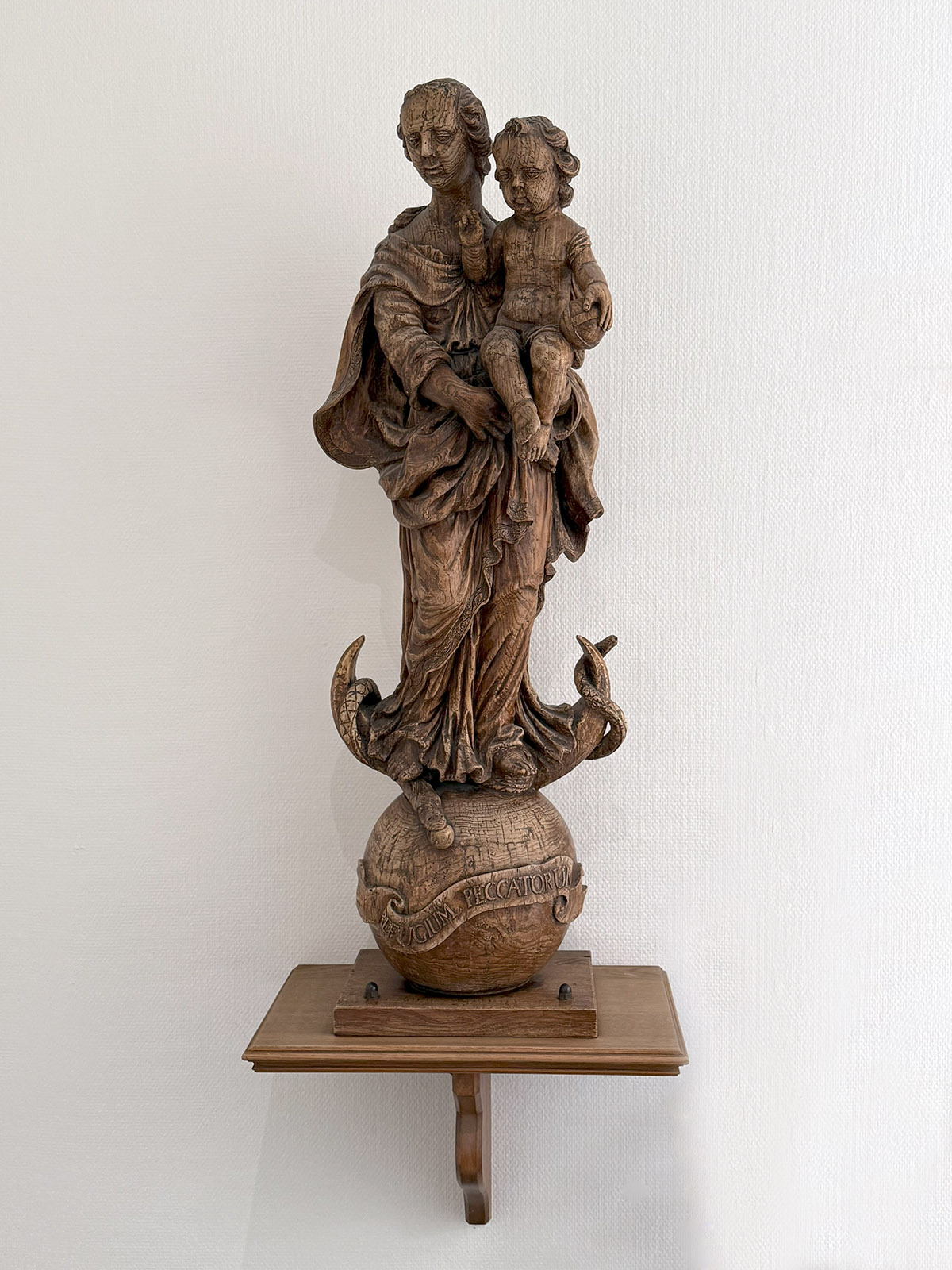 Een onbekende beeldhouwer heeft aan het eind van de achtiende eeuw een beeld gemaakt van O.L. Vrouw met het kindje Jezus. Zij vertrapt het kwaad, dat wordt gesymboliseerd door een slang. Na Napoleon's teruggave van de St. Jan aan de katholieken, heeft deze uitvoering ter vervanging van het originele beeld van de Zoete Moeder in de St. Jan gestaan. Het originele beeld is eerder in 1929, overgebracht naar Brussel. In 1853 keerde het terug naar 's-Hertogenbosch. De familie Van Rijckevorsel schonk toen het achttiende eeuwse beeld aan Reinier van Arkel. |