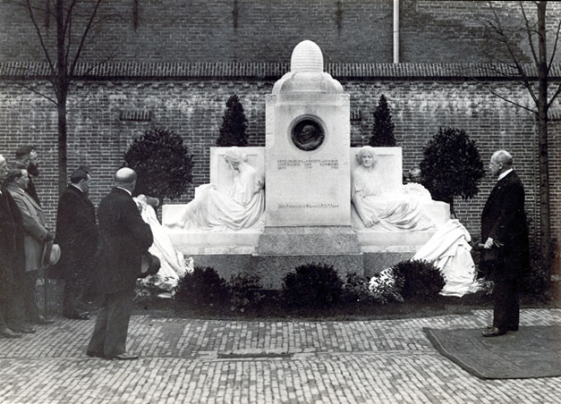 Op 28 maart 1921 werd het monument onthuld, op het plein voor het gouvernementspaleis aan de Verwerstraat. Het stenen middenstuk bevat een bronzen medaillon met de beeltenis van de commissaris en wordt bekroond met een bijenkorf, het symbool van de nijverheid. Dit middenstuk wordt geflankeerd door twee vrouwenfiguren. De linkse 'De Gedachte' is in diepe gedachten verzonken en heeft een boek bij zich. Zij stelt de leiding der industrie voor. De rechtse vrouwenfiguur heeft een hamer in haar hand en achter haar is een tandrad zichtbaar. Zij stelt de arbeid voor als 'De Daad'. Dat de linkse figuur 'De Gedachte' voorstelt is nog goed leesbaar, het onderschrift aan de rechterkant, 'De Daad' is geheel uitgesleten.