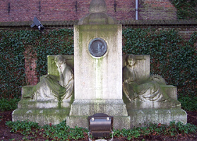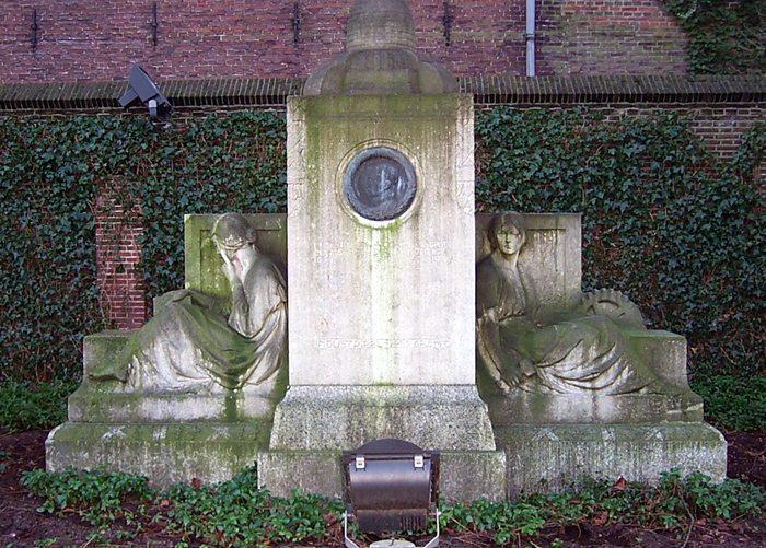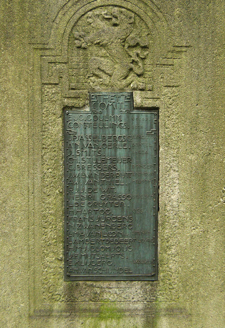 InleidingGedenkteken gelegen in de zuidelijke punt van het voorplein van het voormalige Gouvernement. Het op 28 maart 1921 onthulde monument, dat invloeden vertoont van de Neo-Renaissance, werd ontworpen door drie verschillende kunstenaars. De algehele opzet en de beeltenis in de centrale medaillon werden ontworpen door Huib Luns, de toenmalige directeur van de school voor kunst, techniek en ambacht in Den Bosch; August Falise maakte het model van de vrouwenfiguren aan weerszijden en de Bossche beeldhouwer Jac. Goossens werkte tenslotte het geheel in steen uit (de namen van de uitvoerenden staan vermeld op de zijkant van het middendeel).Het beeld werd aangeboden door een comité van Brabantse industriëlen ter gelegenheid van het 25-jarig ambtsjubileum in 1919 van de commissaris van de koningin, mr. A.E.J. baron van Voorst tot Voorst. Tijdens zijn commissariaat, van 1894 tot 1928, ontwikkelde Brabant zich van een overwegend agrarisch gewest tot een beginnende industriële samenleving. OmschrijvingHet symmetrische, vrijstaande gedenkteken bestaat uit een hoog middendeel op vierkant grondplan en twee lagere vleugels op rechthoekig grondplan, alle op een granieten sokkel. Centraal in het middendeel aan de voorzijde een bronzen medaillon met de omlauwerde beeltenis van de commissaris waaronder de inscripties:mr. A.E.J. BARON VAN VOORST TOT VOORST COMMISSARIS DER KONINGIN 1894 1SEPT 1919 INDUSTRIEEL Nrd BRABANT Aan de achterzijde binnen een decoratieve omlijsting en onder de Brabantse leeuw een bronzen plaquette waarop de namen van de leden van het comité. In het bovenste deel op de randen decoratief beitelwerk. Het middendeel wordt bekroond met een gestileerde bijenkorf, symbool van de nijverheid. Ter linker zijde de personificatie van 'De Gedachte' (onderschrift), een in gedachten verzonken vrouwenfiguur in geplooid gewaad en blootvoets met als attribuut een boek en tegen een omrand achtergrondtableau waarop laurierbladeren. Zij representeert de leiding der industrie. Ter rechterzijde de personificatie van 'De Daad' (onderschrift), eveneens in geplooid gewaad en blootvoets met als attributen een hamer en een tandrad tegen een omrand achtergrondtableau waarop eikenbladeren. Zij representeert de industriearbeiders. WaarderingHet gedenkteken is van algemeen belang. Het object heeft cultuurhistorische waarden als bijzondere uitdrukking van de industriële ontwikkeling van Brabant tussen 1894 en 1919. Het object heeft kunsthistorische waarde wegens de esthetische kwaliteiten van het ontwerp. Het object heeft ensemblewaarde wegens de historische relatie met het belendende voormalige Gouvernement.Het object is van belang wegens de gaafheid en bezit zeldzaamheidswaarde op grond van het drievoudige kunstenaarschap. |