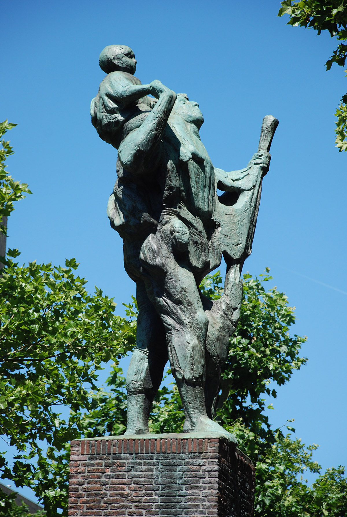 Rechts voor de stationstunnel aan de centrumzijde.afmetingen: 140 x 140 x 350 cm; (sokkel 950 cm)materiaal: brons op bakstenen sokkel datering: 1960 vervaardigd door: V. Semeyn Esser Het beeld van Christoffel, de beschermheilige van de reizigers, werd op 30 juni 1960 onthuld door burgemeester Loeff, drieëneenhalf jaar na de ingebruikname van de stationstunnel. Het beeld -in tamelijk grove, naturalistische stijl- is veel meer dan levensgroot en dit laatste wordt nog benadrukt door de enorm hoge sokkel waarop het beeld is geplaatst. | 66 |