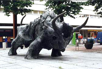 El Toro in de 'Colonade' ofwel de toegang naar de Arena. De Spaanse kunstenaar/beeldhouwer Juan Ripollès onthulde donderdag 18 april 2002 zijn creatie.