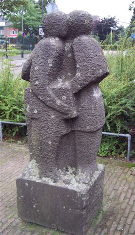 Openbare Basisschool De Springplank, Hambakendreef 2a / hoek Klokkenlaan, zijde Hambakendreefafmetingen: 65 x 50 x 175 cmmateriaal: hardsteen (beeld en sokkel uit een blok) datering: 1974-1975 vervaardigd door: Frans van der Burgt Voorgesteld zijn drie sterk geabstraheerde pratende kinderfiguurtjes. Doordat ze zeer dicht tegen elkaar staan blijft de blokvorm van het beeld behouden. Het oppervlak is bedekt met grove haksporen hetgeen een soort rustica-effect geeft. Het beeldje is geplaatst kort na de opening van de school in het kader van de percentage-regeling.145 | 84 |