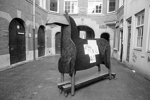 Korte Waterstraat, Knillespoort.materiaal: houtplaat, hardhout, messing en vernisdatering: 1985 vervaardigd door: Sander Dorenbosch Het is een transportabel eenvoudig houten paard dat gebruikt wordt als reclamepaard door de Raadsgroepering Knillis. Het werk is eigendom van de gemeente en in beheer van de Dienst Beeldende Kunst; de Stichting Knillis heeft het in langdurige bruikleen. | 100 |
