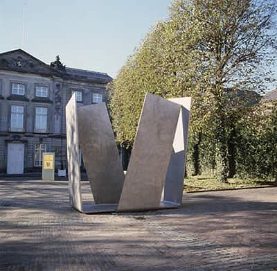 | 175. | De Volkskrant d.d. 23 april 1988. Vanuit de Bossche kringen is er nogal wat commentaar gekomen op de plaatsing van dit moderne, strakke object op het plein voor het museum. Men vindt dat het er absoluut niet past. Er zijn stemmen opgegaan om het te laten verwijderen, doch de directie van het museum vindt zich prima geslaagd in haar opzet: "het werk harmonieert prachtig met de gevel en het voorplein". |