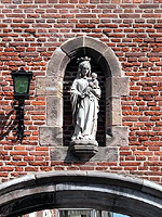 Hooge Steenweg, in een nis in de Ruische Poortafmetingen: 30 x 100 cmmateriaal: natuursteen datering: 1927 vervaardigd door: Jac. Goossens De Ruische Poort dateert uit de eerste helft van de zestiende eeuw en vormde toegang tot het refugiehuis van het klooster Mariënhage te Eindhoven. In 1629 moesten de geestelijken het pand verlaten en in 1648 werd het aangekocht door Johan Ruisch, aan wie de poort haar naam dankt. In 1924 werd de poort eigendom van de gemeente 's-Hertogenbosch, die tot restauratie besloot. Deze vond plaats in 1927 (zie steen in de achterzijde van de poort): De pleiserlaag die erop zat werd weggehaald en in de oorspronkelijke baksteen werd een nis aangebracht., waarin een Mariabeeld werd geplaatst, vervaardigd door Jac. Goossens.50 | 40 |