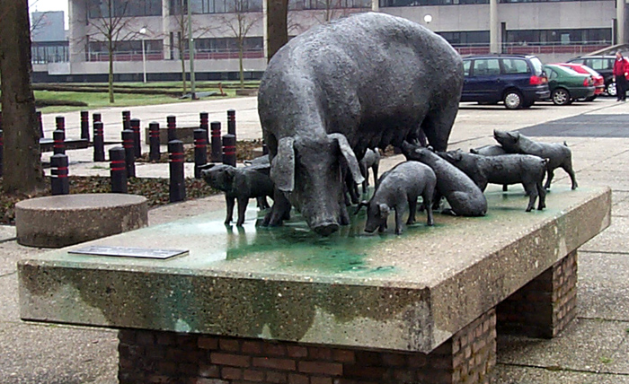 Provinciehuis, Brabantlaan 1, voorpleinafmetingen: 365 x 187 x 110 cm; (plateau) 365 x 187 x 27 cmmateriaal: brons op betonnen plateau datering: 1979 vervaardigd door: Kees Jansen Een naturalistische voorstelling van een staande zeug en elf biggen, geplaatst op een betonnen plateau, dat weer steunt op vier bakstenen sokkels. Het monument werd opgericht ter ere van het Brabantse varken op initiatief van de Vereniging van Varkenshouders van de Noord-Brabantse Christelijke Boerenbond, die haar derde lustrum vierde. In samenwerking met het Kunstcentrum Brabant werd de kunstenaar Kees Jansen aangezocht. | 88 |