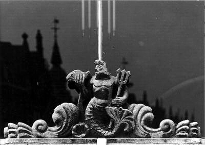 Beeld van de kunstenaar J. Uiterwaal voorstellende Neptunus boven de ingang van het gebouw rechts van het station.