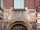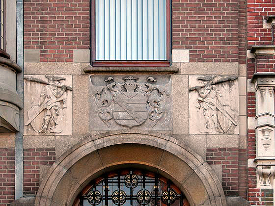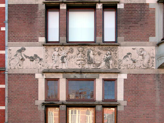 Oranje Nassaulaan 26, in de voorgevelafmetingen: (groot reliëf) 520 x 85 cm; (reliëf hoog in de gevel) 280 x 60 cm; (wapensteen boven de ingang) 110 x 85 cmmateriaal: Franse kalksteen en andere natuursteen datering: 1970-1972 vervaardigd door: Jacques de Bresser139 Boven de ramen van de eerste verdieping bevindt zich een liggend langwerpig reliëf over een lengte van 520 cm. Voorgesteld zijn 'Lente', 'Zomer', 'Herfst' en 'Winter', hetgeen ook op het reliëf staat vermeld. Van links naar rechts zijn afgebeeld een engeltje met bloemen, die aan een vrouwelijke figuur worden aangeboden; een man met korenaren en een vrouw met een sikkel; een man met een druiventros en een mand met fruit, een zittende vrouw met een kind onder een fruitboom; een oude man die de handen warmt aan een pot met gloeiende kooltjes alsmede een oude vrouw. Boven de ingang bevindt zich een wapensteen in een andere steensoort en een reliëf met twee halffiguren, twee engelen, oprijzend uit gestileerde golven, alsmede de tekst 'salve'. Het pand is gebouwd in 1903 voor Jhr. Sassen van Ysselt (het wapen is dan ook zijn familiewapen). Het oorspronkelijke beeldhouwwerk in de voorgevel was gemaakt door het atelier Jac. en Jos. Goossens naar ontwerp van de architect Heyboom. Het materiaal was Duitse zandsteen, maar in de loop der tijd is dat ongeschikt gebleken. Toen de huidige eigenaar het pand in 1960 kocht waren de reliëfs helemaal verweerd. Begin jaren zeventig heeft men ze laten verwijderen en laten copiëren door Jacques de Bresser in een hardere Franse kalksteen. | 80 |