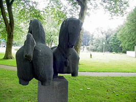 Hardstenen sokkel met bronzen beeld 219 x 272 x 90 cm.