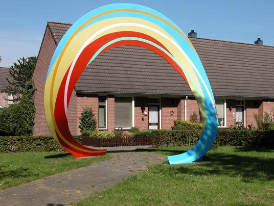 Kwartierenlaan, in de wijk Maaspoortafmetingen: 550 x 425 x 475 cm; (plaatstaal) dikte 2 cmmateriaal: in kleuren gespoten staal datering: 1986 vervaardigd door: Janus Metsaars Over een pad in een plantsoentje is een gekleurde boog van plaatstaal geplaatst. De uiteinden zijn aan de grond 35 cm breed, maar de boog wordt naar boven toe breder (in het midden ca 100 cm). De kleuren, zeegroen, geel, roze en rood lopen in elkaar over. Het kunstwerk is uitgevoerd in opdracht van de gemeente 's-Hertogenbosch in het kader van de stadsverfraaiing. | 104 |