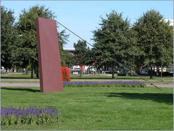 Bruistensingel, ter hoogte van de kruising met de Hervensebaanafmetingen: (plaatstalen element) 230 x 30 x 700 cmmateriaal: plaatstaal en stalen kabels datering: 1984 vervaardigd door: Theo Wagemakers Het kunstwerk bestaat uit een constructie van roestbruin plaatstaal en stalen kabels. Het staande en hellende plaatstalen element is aan de bovenzijde verbonden met de staalkabel, die daar in twee richtingen naar beneden gaat en in de bodem is verankerd. Het werd in opdracht van de gemeente geplaatst in het kader van de stadsverfraaiing. | 98 |