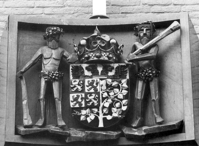 Stadskantoor, Wolvenhoek 1, aan de gevel boven de hoofdingangafmetingen: 135 x 82 cmmateriaal: staal, messing, koper, bewerkt met emaille, lak en bladgoud datering: 1979 vervaardigd door: Cees Clement Het stadswapen van 's-Hertogenbosch volgens de officiële wapenbeschrijving op 8 maart 1978 bij Koninklijk Besluit bekrachtigd. In de oudst bekende vorm had het stadswapen slechts drie bomen. In 1356 werd het uitgebreid met het wapen van de Hertogen van Brabant. Toen deze ook Hertogen van Limburg werden, werd ook de Limburgse leeuw opgenomen. In 1508 werd het wapen weer uitgebreid met de Habsburgse dubbelkoppige adelaar boven het wapen en de boom. Het wapen bestaat uit vier kwartieren: het eerste en vierde de Brabantse leeuw, goud op zwart; het tweede en derde de dubbelstaartige Limburgse Leeuw, rood op zilver. De boom onder en rechts van het wapen is goud op zwart (dit was op het vroegere Bossche wapen groen op zwart). Sinds 1670 wordt het stadswapen bekroond met een gouden kroon, die door twee wildemannen -hier met vlakke gestileerde lichamen- wordt vastgehouden. Het is niet bekend waarom die er bij zijn gekomen. | 88 |