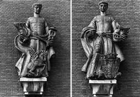 Station van de Nederlandse Spoorwegen. Stationspleinafmetingen: (linkerfiguur) 150 x 320 cm; (linkerbeeldje) 175 x 75 cm; (rechterbeeldje) 175 x 75 cm; (rechterfiguur) 150 x 320 cmmateriaal: natuursteen datering: 1952 vervaardigd door: Jo Uiterwaal Het grote beeld links is Mercurius met Pegasus: een mannelijk figuur en een paard. Het grote beeld rechts stelt Carnaval voor: een mannelijke figuur met een masker in de hand en wapensteen aan de voeten. Beide mannelijke figuren hebben een hiëratische uitdrukking op het gezicht en zijn gekleed in een soort tunica met gestileerde plooien. De kleine beeldjes boven de ingangen zijn (links) Neptunus op gestileerde golven en met een drietand in de hand en (rechts) een zittende jongen met Phoenix met links en rechts gestileerde bomen en wolken. De figuur van Neptunus en ook de zittende jongen zijn wat stijf en weinig gedetailleerd. Jo Uiterwaal heeft veel gewerkt voor N.S.-stations in het zuiden van het land, in samenwerking met architect S. van Ravestijn.101 | 59 |