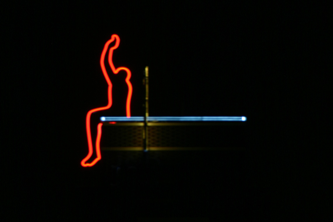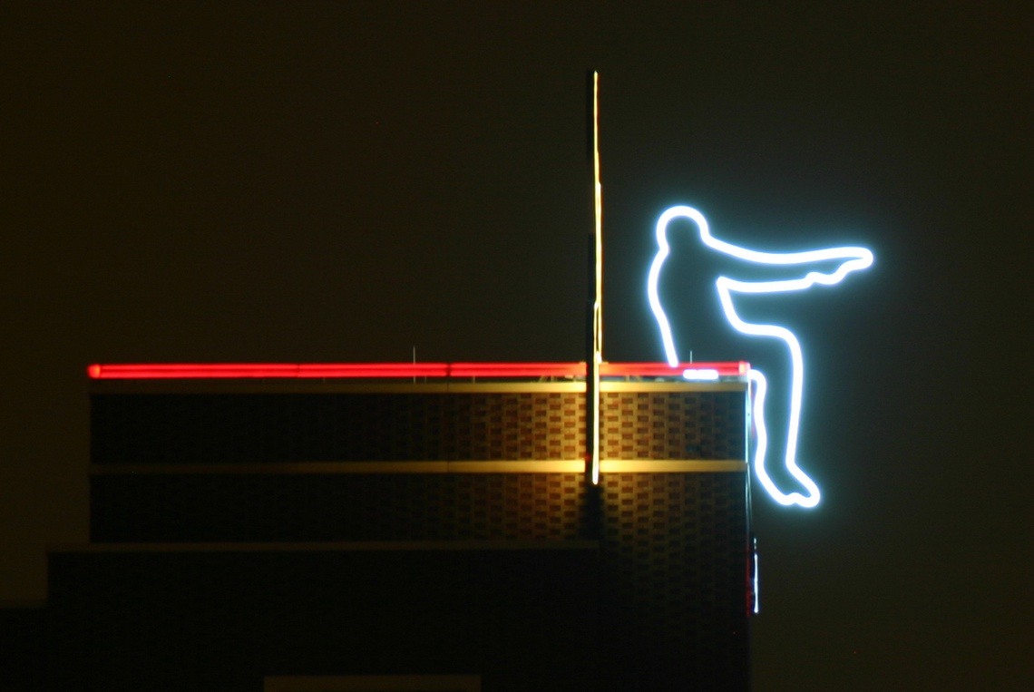 De keuze voor open lijnfiguren zorgt voor herkenbaarheid op grote afstand, ook gaan de figuren door de gesuggereerde transparantie een zekere interactie met de omgeving aan; alsof de wuivende man bij momenten speelt met de wolken, de vogels en voorbij glijdende luchtbalonnen.