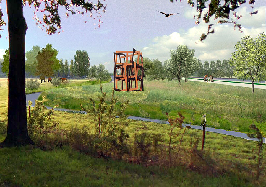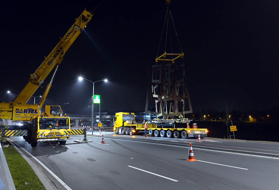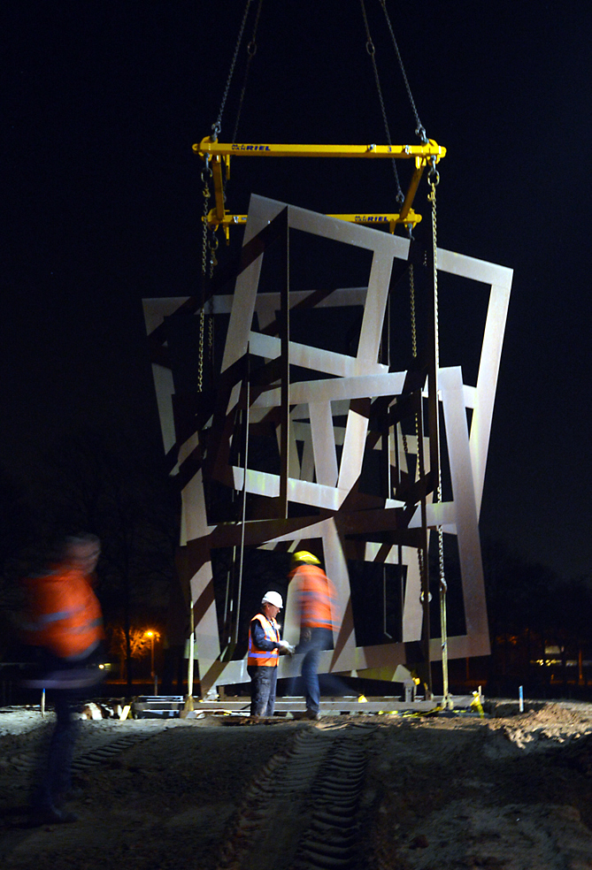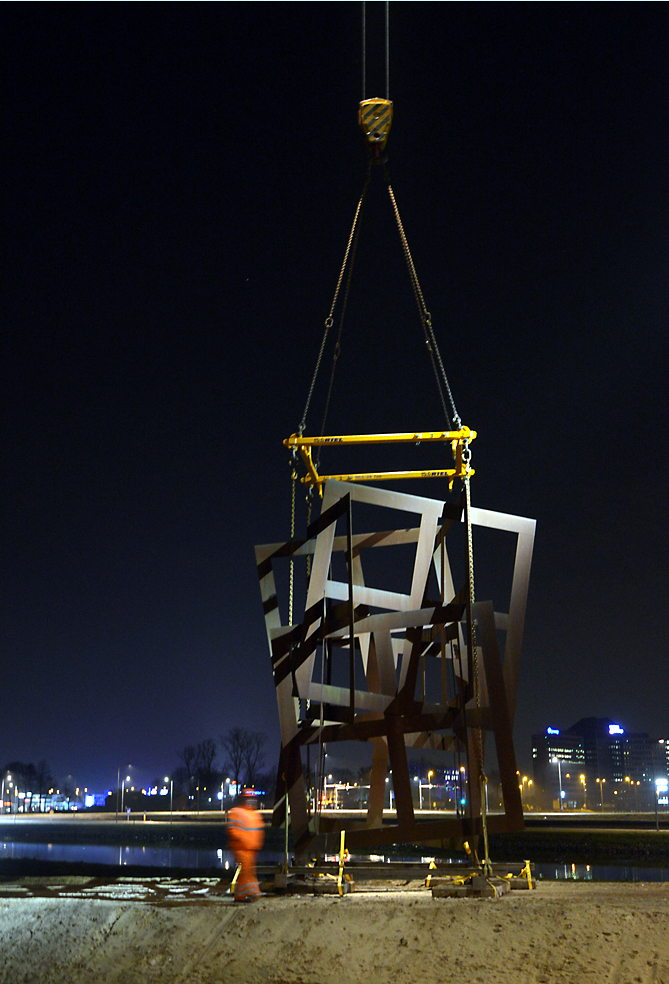 Zowel doorzichtigheid als massa te verbeelden, zowel een gebouw als een sculptuur. Kortom het Wandelend vierkant is een 'onmogelijk'-lenig metaalvlechtsel.
