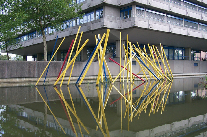 Schubertsingel 32, achterzijde, in het waterafmetingen: (boven de waterlijn) 400 cmmateriaal: stalen balken en buizen, geel, rood en blauw gespoten datering: 1981 vervaardigd door: Auke de Vries Omgevingskunst in de vorm van een aantal ronde en vierkante stalen balken van verschillende diktes (2 rode, 4 blauwe en 35 gele), willekeurig en scheef als sterk vergrote rietstengels in het water geplaatst. | 93 |