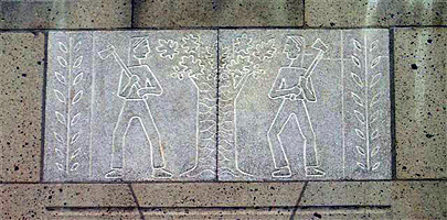 Het huizen blok aan de J. Obrechtsstraat 20 en 22, Gregoriussingel 17 en de Gen. Arezzostraat 23, in de voorgevels boven de voordeurafmetingen: 145 x 65 cmmateriaal: natuursteen datering: 1954-1955 maker: onbekend Bij vier van de negen huizen zit een rechthoekig laagreliëf in een vlakke, lineaire stijl met gestileerde en symmetrische voorstellingen van vrouwelijke en mannelijke figuren, paarden, bloemen en planten. Het huizenblok is in 1953 ontworpen door de architekt Fr. Grips. Op de bouwtekeningen staat alleen bij het huis in de Arezzostraat de omtrek van het reliëf ingetekend. In 1954/1955 zijn de huizen gebouwd en was de gemeente nog eigenaar van de grond.114 Het is onbekend of de reliëfs nog een speciale betekenis hebben. | 62 |