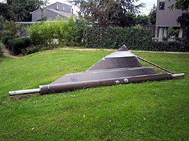Kloosterlaan, in plantsoen langs het waterafmetingen: 545 x 270 x 96 cm; (plaatstaal) 230 x 220; (rol) 250 cmmateriaal: plaatstaal, massief gegalvaniseerd ijzer; zwarte mijnsteen datering: 1986 vervaardigd door: Michèle van Kemenade Een pastelgroen en donkerrood gespoten constructie van ijzeren staven en een driehoekig, golvend plaatstalen element, bevestigd aan een massieve ijzeren rol. Het geheel lijkt op een rol doek waarvan een gedeelte -uitlopend in een punt- golvend is afgerold. Het kunstwerk is door de gemeente geplaatst in het kader van de stadsverfraaiing. | 106 |