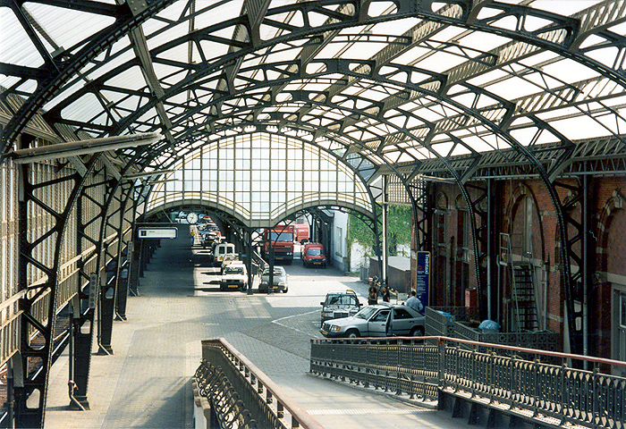 StationsoverkappingenStationspleinDe Bossche stationskappen dateren uit 1894-1896. Ze hoorden bij het vroegere stationsgebouw (1896) dat in 1944 zwaar werd beschadigd. De stationskappen zijn echter gespaard gebleven. Zij zijn in meerdere opzichten bijzonder. De totale lengte bedraagt 450 meter (de toenmalige langste stationskap ter wereld was die van het Centraal Station in Amsterdam, 306 meter). De Bossche stationskappen zijn, voor zover bekend, de eerste in Nederland die zijn uitgevoerd in staal, daarvóór werd welijzer toegepast. De constructie is opgebouwd uit gebogen vakwerkkniespanten en vakwerkgordingen.In 1997 en 1998 zijn de stationskappen gerestaureerd door Holland Railconsult.