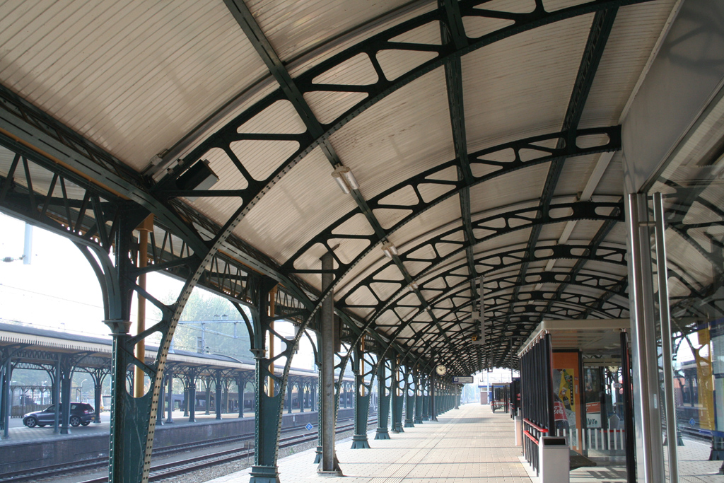 InleidingTwee tussen het Stationsplein en de Parallelweg gesitueerde ijzeren perronoverkappingen naar ontwerp van ir. G.W. van Heukelom in 1896 gebouwd door de Koninklijke Nederlandse Machinefabriek v/h E.H. Begemann te Helmond.Omschrijving kap 1e perronDe kap bestaat uit twee lage gedeelten met in het midden de hoge kap. De totale lengte is ca 500 m en de breedte van de hoge kap is ca 15 m; de lage kappen hebben de halve breedte. Aan de noordzijde is de lage kap gedeeltelijke verdubbeld; de ijzerconstructie kan worden gekarakteriseerd als vakwerkknieboogspanten met omgebogen onderrand, geplaatst op gietijzeren scharnierende basementen, met in de lengte van de kap vakwerkliggers, waarvan de uiteinden in hoogte toenemen; de hoge kap rust op dubbele gekoppelde vakwerkknieboogspanten; de luifels zijn aan beide zijden aangebracht en rusten op vakwerkconsoles.Omschrijving kap 2e perronDe ongeveer 450 m lange en 15 meter en brede overkapping is opgebouwd uit vakwerk- knieboogspanten met gebogen onderrand, die geplaatst zijn op gietijzeren scharnierende basementen; de kap rust op vakwerkliggers die als gordingen zijn aangebracht; aan de kap luifels op vakwerkconsoles; in het midden hoog gedeelte op dubbele gekoppelde vakwerk- knieboogspanten met glaswanden naar de sporen, en bij de overgang van de hoge naar de lage kap; langs de met hout gedekte kap en luifels is een lambrekijn aangebracht en op het uiteinde van de kap een palmet.WaarderingDe ijzerconstructie van de overkappingen is kenmerkend voor de tijd van ontstaan, verkeert in vrijwel authentieke staat en is als perron-overkapping in deze vorm - knieboogspant onder boogkap met een hoog en een laag gedeelte - representatief en karakteristiek voor de ontwikkelingen in de stationskap- en overspanningsconstructies; in Nederland is een dergelijke overkapping zeldzaam in de spoorweg-architectuur, in het oeuvre van ir. Van Heukelom is deze overkapping uniek te noemen.De ijzeren perronoverkappingen zijn op grond van de voor die tijd kenmerkende constructiewijze en oorspronkelijke vormgeving van architectuur- en cultuurhistorische waarde, alsmede van belang als evident monument van jongere bouwkunst wegens de zeldzaamheidswaarde in de 19e-eeuwse spoorweg-architectuur en uniciteitswaarde in het oeuvre van de ontwerper. |