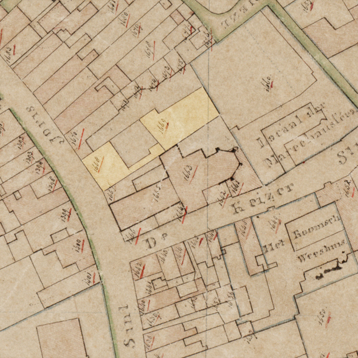 | 6. | Haar man had dat huis in 1524 (Reg. n° 127 f. 433 vso) gekocht van mr Ewald Mallants Janszn, die het 1513 (Reg. n° 108 f. lö6) had gekocht van Gijsbert, zoon van Gerard Toelinck Gijsbertszn. Jacob Torsingh kocht dit huis 28 Juli 1712 (Reg. n° 530 f. 30 vso). Het is thans genummerd 26. |