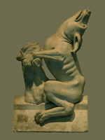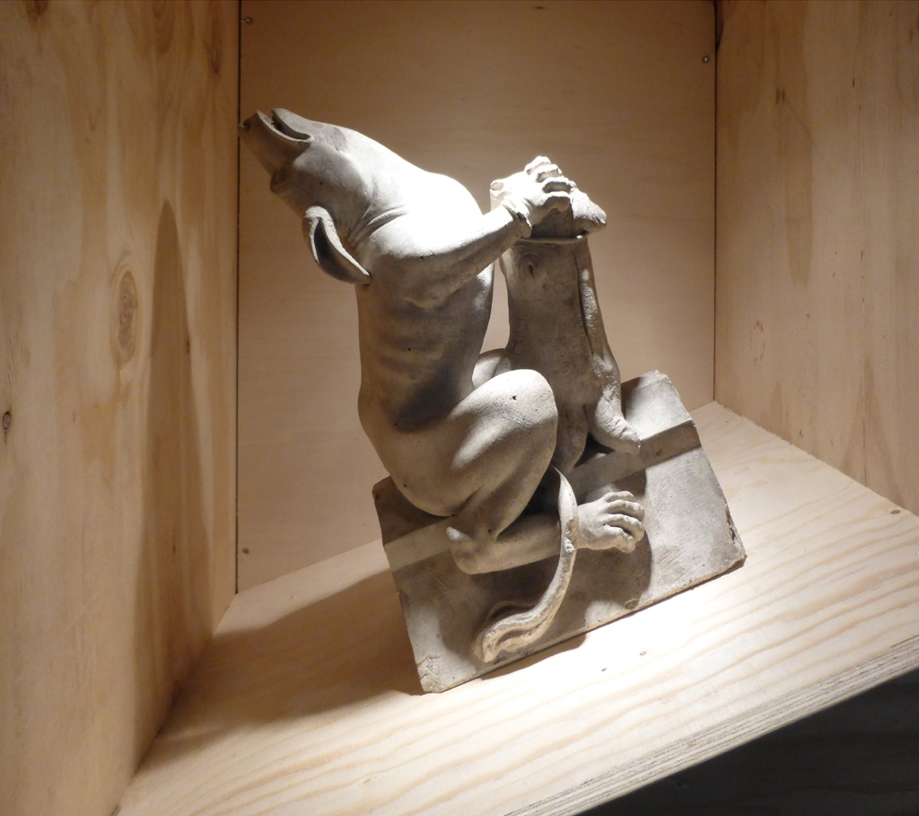 C. PeetersLuchtboogbeelden van het schipN VI. 6. Vos of hond, met achterover geworpen kop, de voorpoten aan een boomstam gebonden. Mosmans X. Bouwloods nr. 272. De Sint Janskathedraal 's-Hertogenbosch (1985) 258 |
